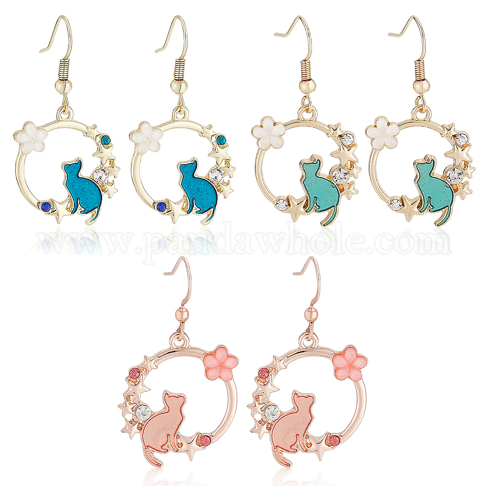 3 пары 3 цвета серьги-подвески в виде цветка из смолы, эмалевой кошки и звезды со стразами, украшения из легкого золотого сплава для женщин
