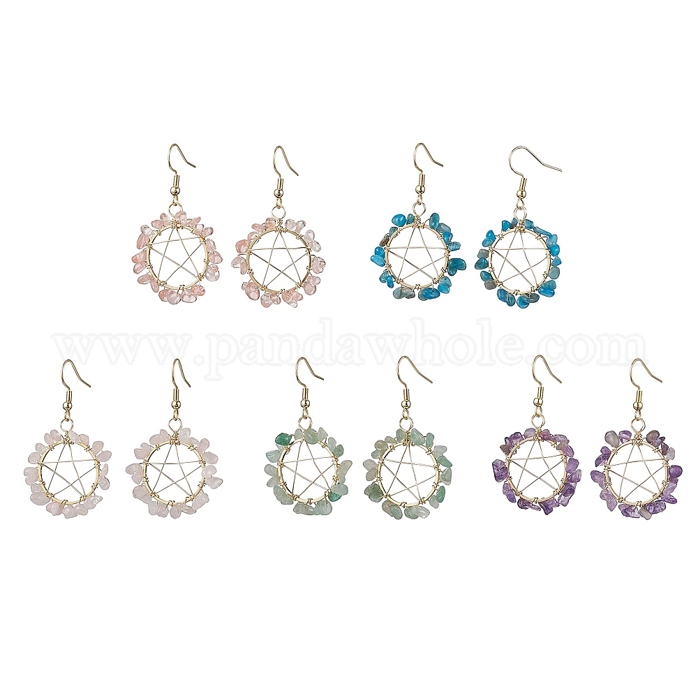 Серьги с подвесками из смешанных натуральных и синтетических драгоценных камней, серьги из золотой проволоки со звездами