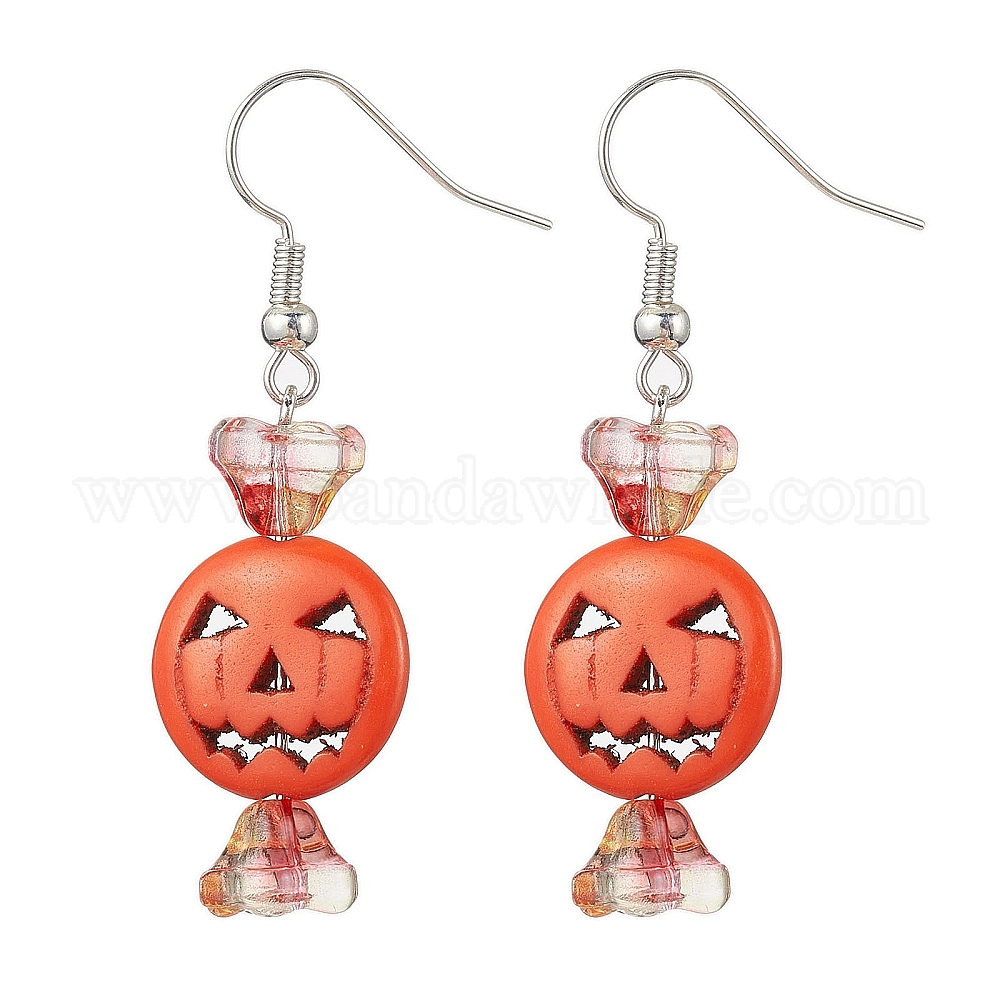 • Коралловый Серьги с подвесками из окрашенной синтетической бирюзы и стекла, Латунные крючки для сережек, штифты головки железа, длинные серьги-подвески Halloween с тыквой и цветком, коралл, 48x15 мм