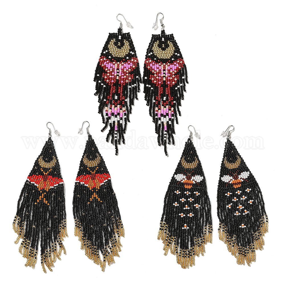 • Разноцветный Серьги с подвесками из тканых стеклянных бусин в богемном стиле, железные серьги-люстры с кисточками для женщин, бабочка, красочный, 140 мм, Кулон : 120x37.5 мм