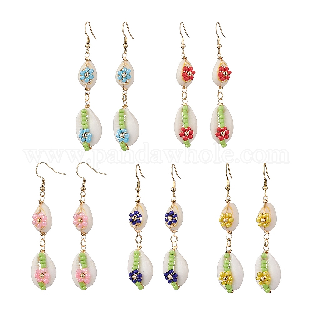Серьги-подвески в виде цветка ракушки каури, с бисером и 304 крючками из нержавеющей стали, золотые