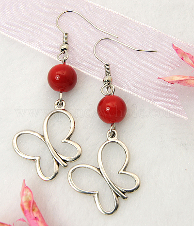 • Красный Болтаться серьги бабочки, кулоны тибетского стиля, стеклянные бусы и серьги крюк латуни, красные, 53 мм