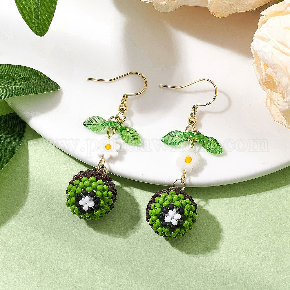 Серьги с подвесками из стеклянного бисера, узоры ткацкого станка, с акриловым листом и цветком лэмпворк, киви