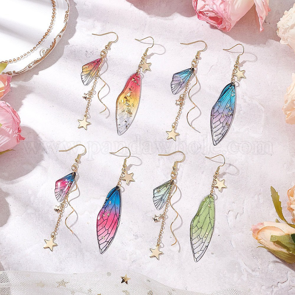 4 пары 4 цвета прозрачные серьги-подвески из смолы, с латунной подвеской, цепочкой и крючками для сережек, крыло бабочки, слева и справа (02ZTMZ)