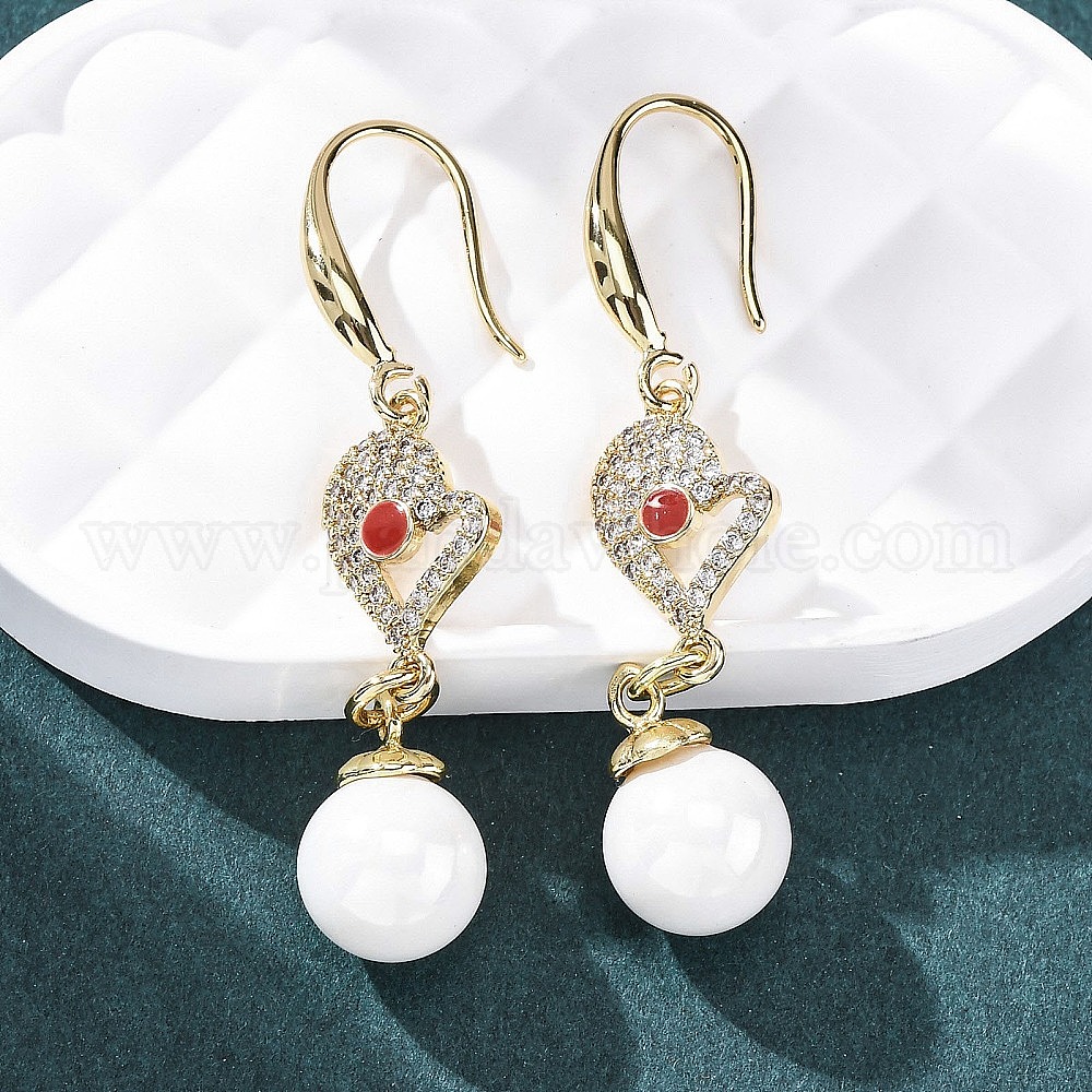 Серьги-подвески из латуни с прозрачным кубическим цирконием и прозрачным паве, с эмалью и искусственным жемчугом из АБС-пластика, стойки покрытие, долговечный, без свинца и без кадмия, сердце и круглый
