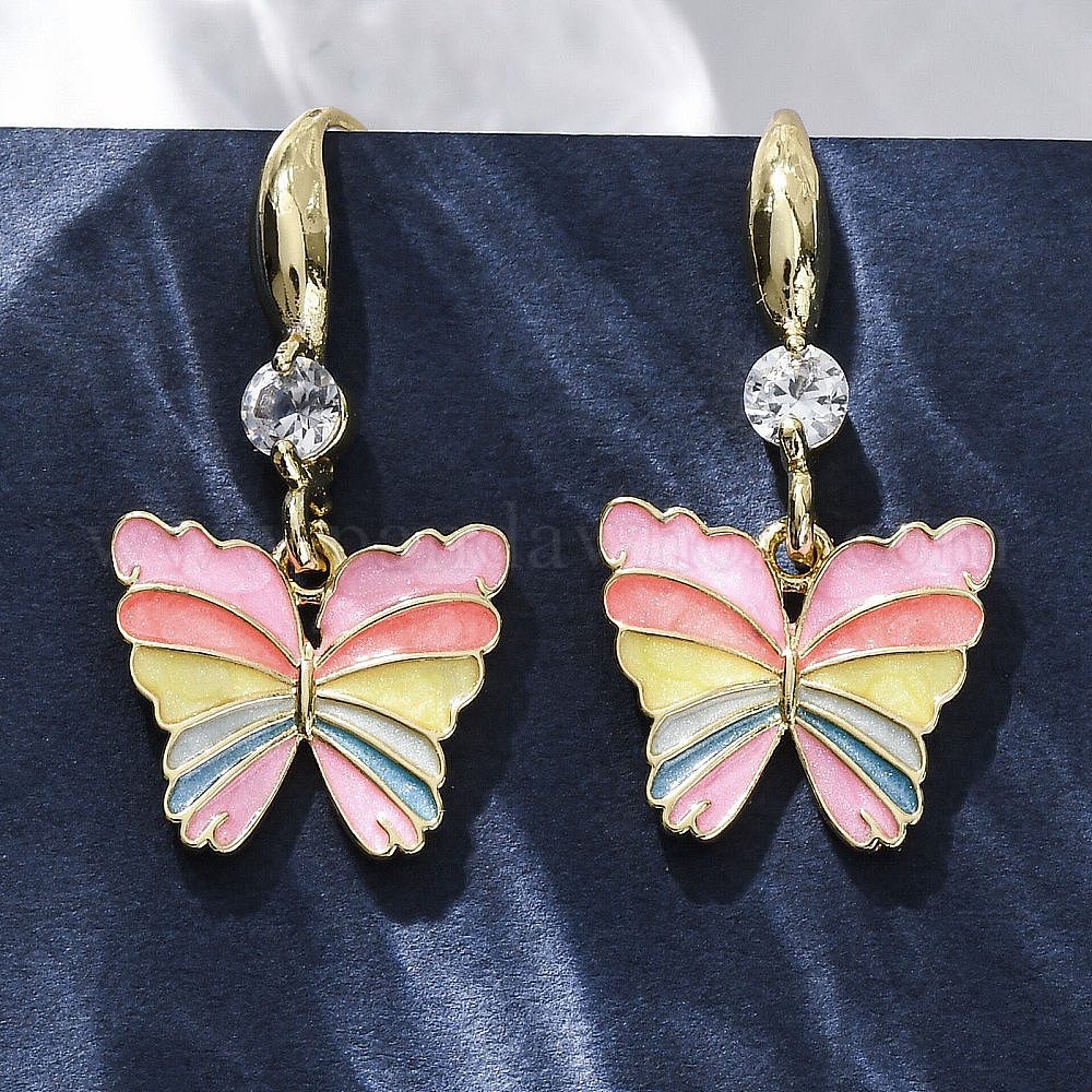 Серьги-подвески из латуни с прозрачным кубическим цирконием и прозрачным паве, с эмалью, стойки покрытие, долговечный, без свинца и без кадмия, бабочка