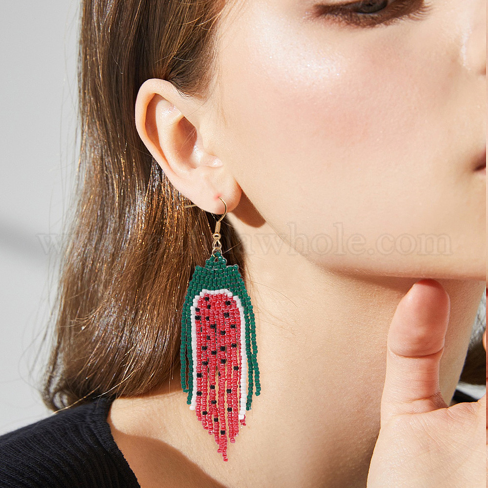 • Золотой Серьги-подвески из бисера ручной работы в виде арбуза, золотые, 75x35 мм