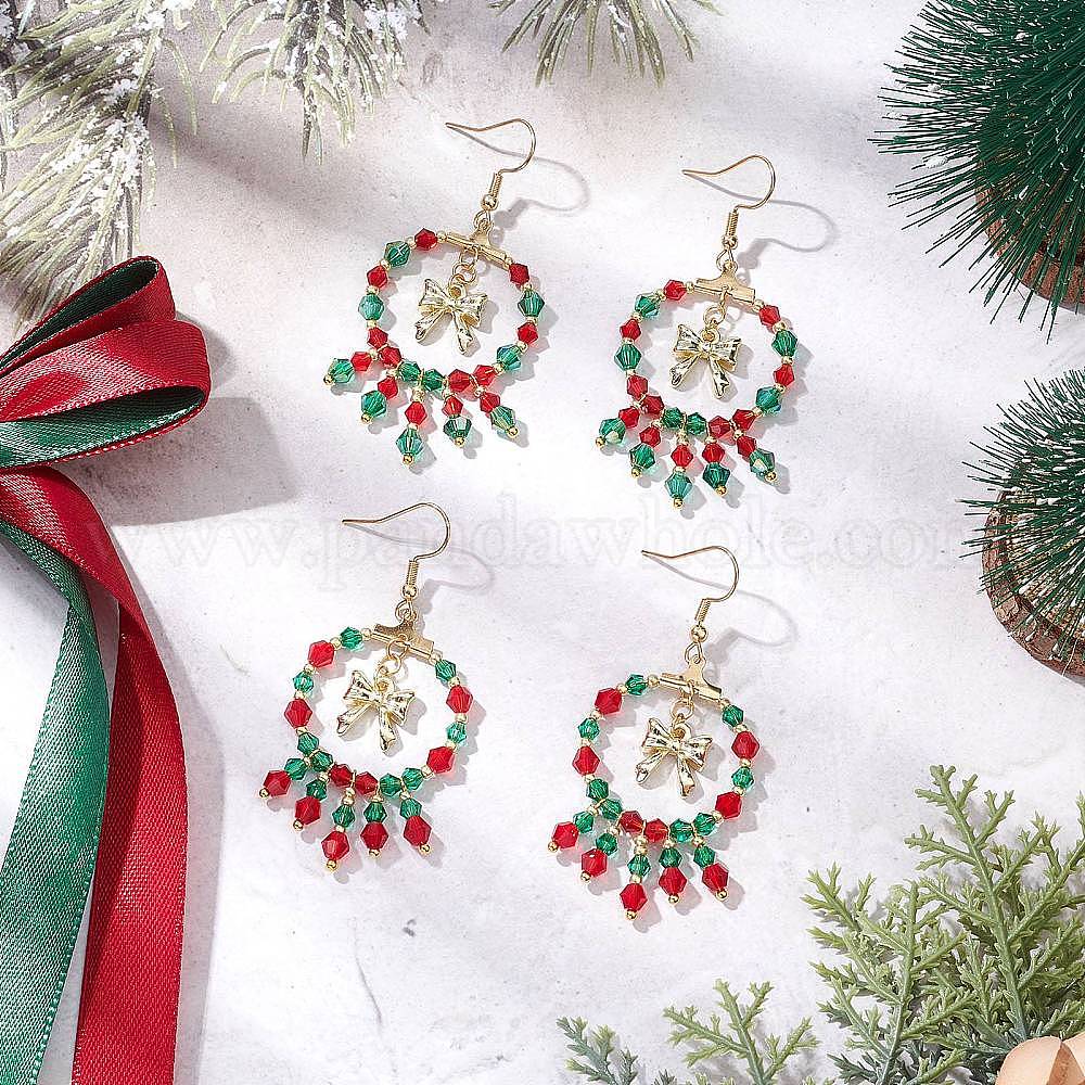 • Зеленый Серьги-подвески из стеклянных бусин ручной работы на рождественскую тематику, с подвеской-бантом из сплава и 304 крючками для сережек из нержавеющей стали, золотые, зелёные, 63x29 мм