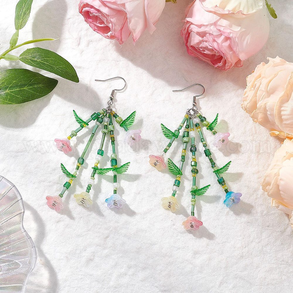 Болтающие серьги из стекла, цветок, с акрилом и ракушечным жемчугом (035DRN)