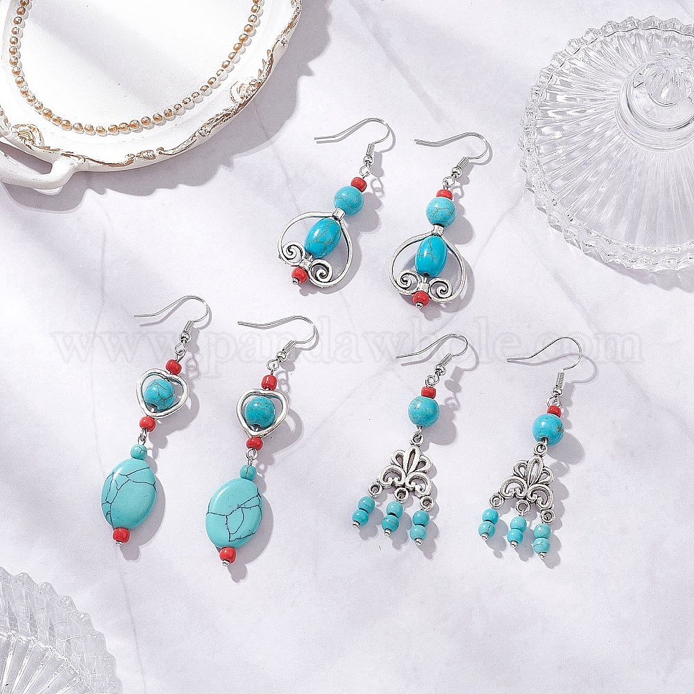 3 пары серег-подвесок из синтетической бирюзы в тибетском стиле, овальные