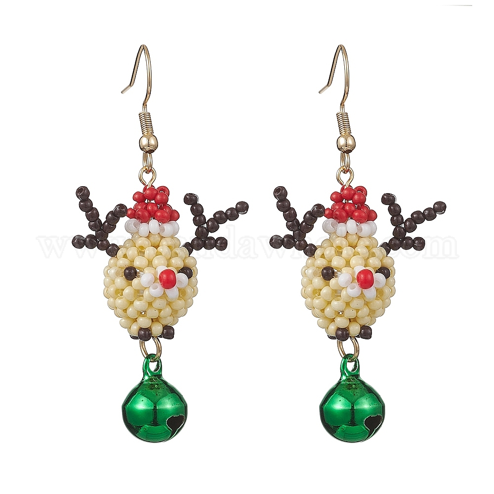 Серьги-подвески в виде оленей из стеклянных бусин, со стеклянными жемчужными бусинами и латунным колокольчиком 304 крючки для сережек из нержавеющей стали