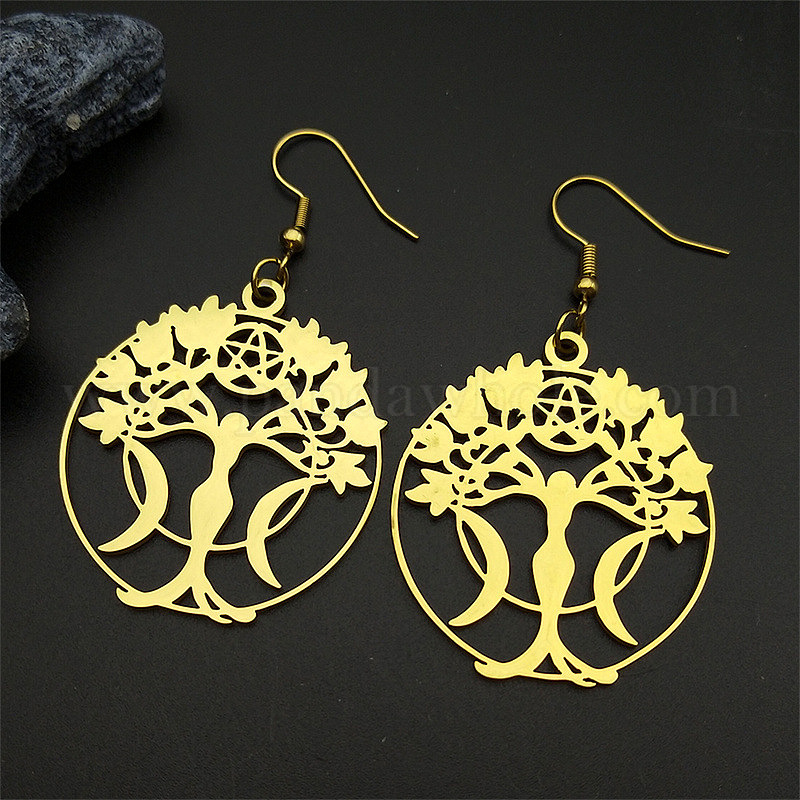 • Золотой 304 из нержавеющей стали болтаться серьги, плоские круглые с дерева жизни, золотые, 57x35 мм