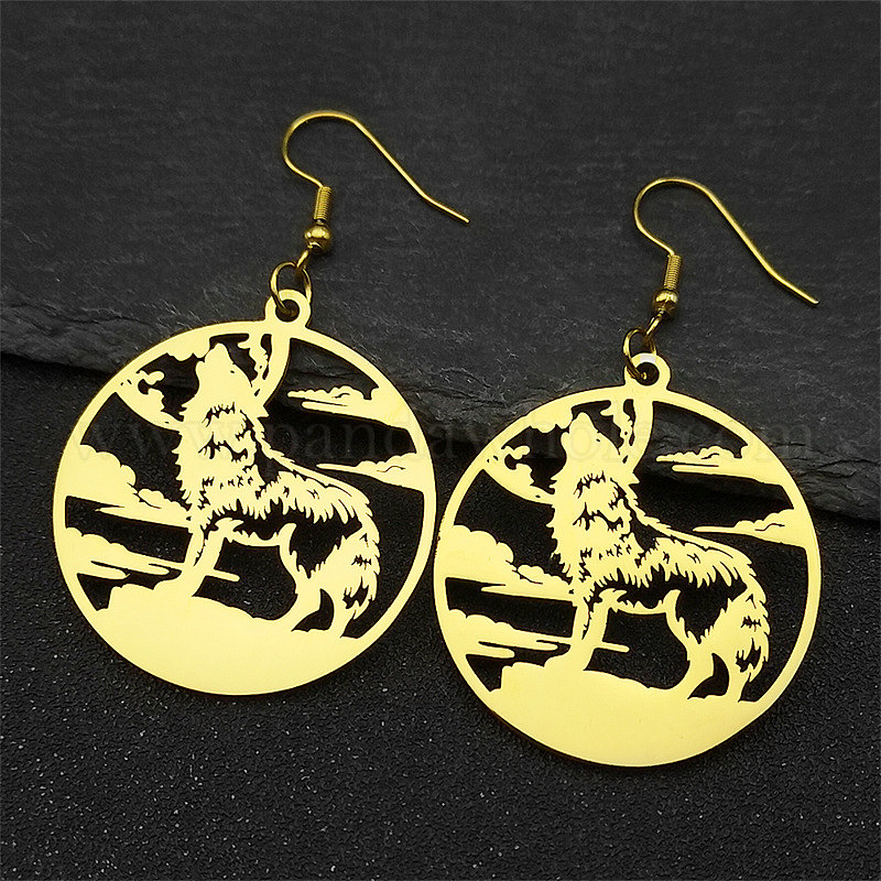 304 из нержавеющей стали болтаться серьги, плоский круглый с волчьим узором