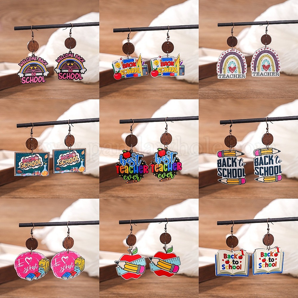 Деревянные серьги-подвески с принтом ко Дню учителя.
