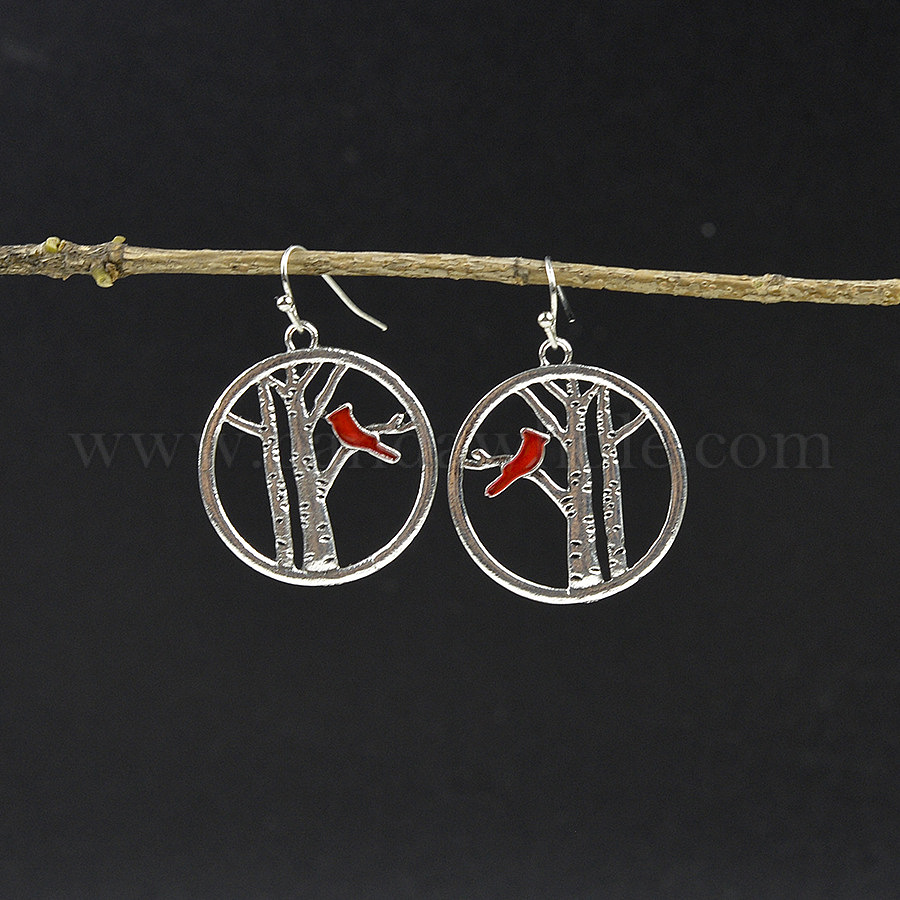 Серьги-подвески из цинкового сплава с эмалью, кольцо с веткой и красной птицей