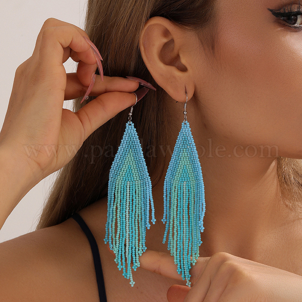 • Светло-Голубой Серьги-кисточки из стеклянного бисера ручной работы, С 304 результатами из нержавеющей стали, стрелка шаблон, платина, Небесно-голубой, 140x37 мм
