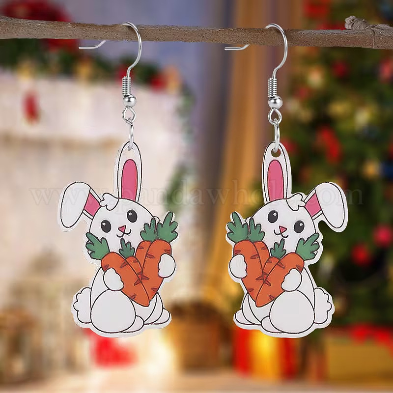 Пасхальные акриловые серьги-подвески, кролик с морковкой, платина