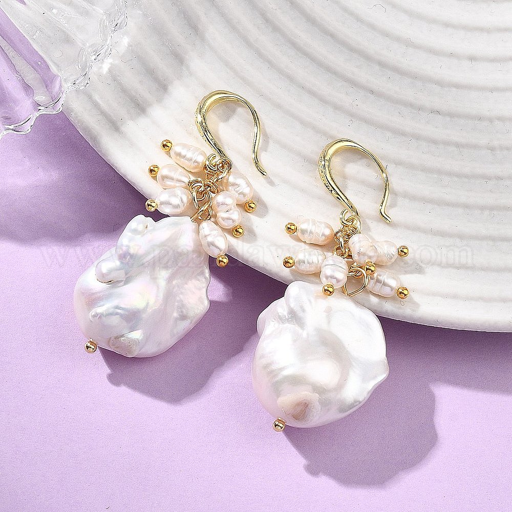 • Золотой Натуральный кеши жемчуг мотаться серьги, с фурнитурой для сережек из нержавеющей стали, самородки, золотые, 49~52x19~21 мм