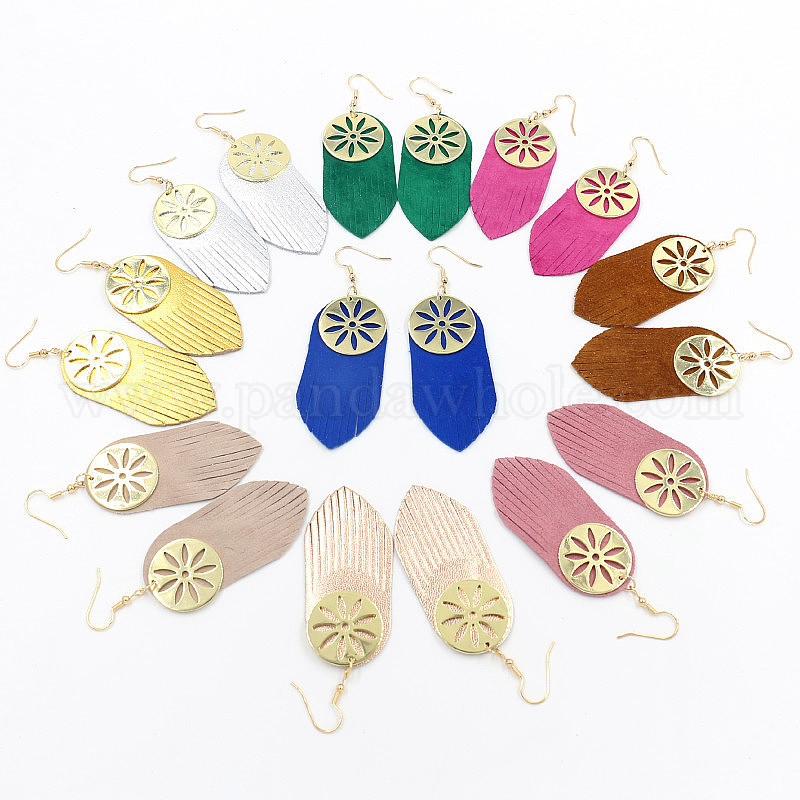 Богемные серьги-подвески из сплава и овечьей шкуры с кисточками, плоские круглые с цветочным узором, золотые
