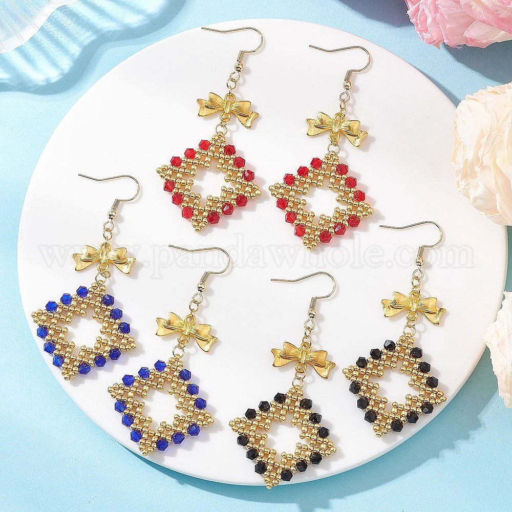 3 пары стеклянных подвесных серег, ромб, с фурнитурой из сплава и 304 нержавеющей стали, золотые