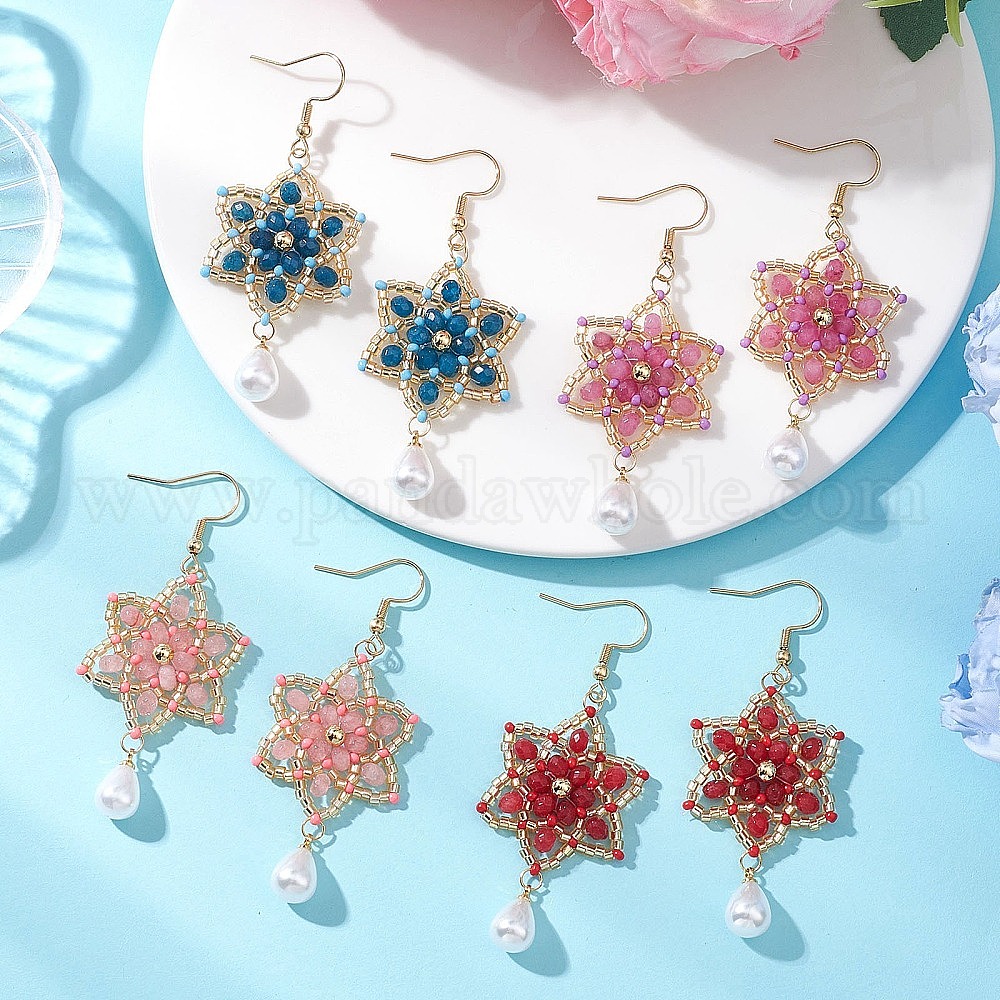Серьги-подвески в форме цветка из натурального малазийского нефрита и стеклянного бисера, украшенные крашеными цветами., с фурнитурой для сережек из нержавеющей стали, золотые
