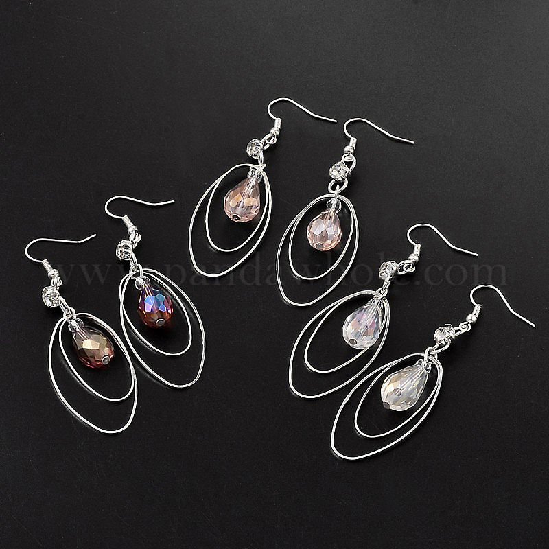Серьги-подвески со стеклянными бусинами в форме капли, с посеребренными латунными выводами, 70x21x10 мм, штифты : 0.6 мм