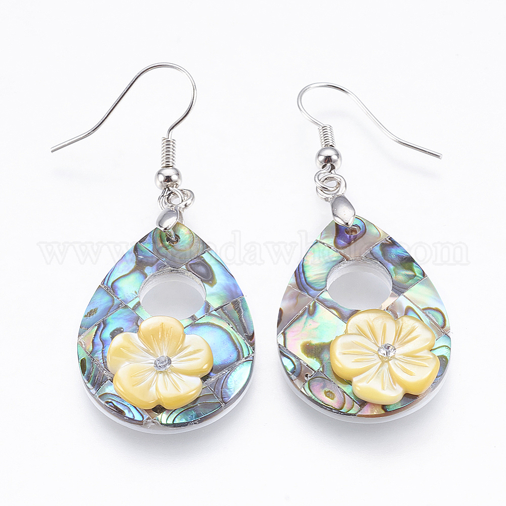 • Раковина Серьги с раковиной ушка / ракушка, с латунными находками и желтой оболочкой, слезинка с цветком, 50~50.5 мм, штифты : 0.7 мм