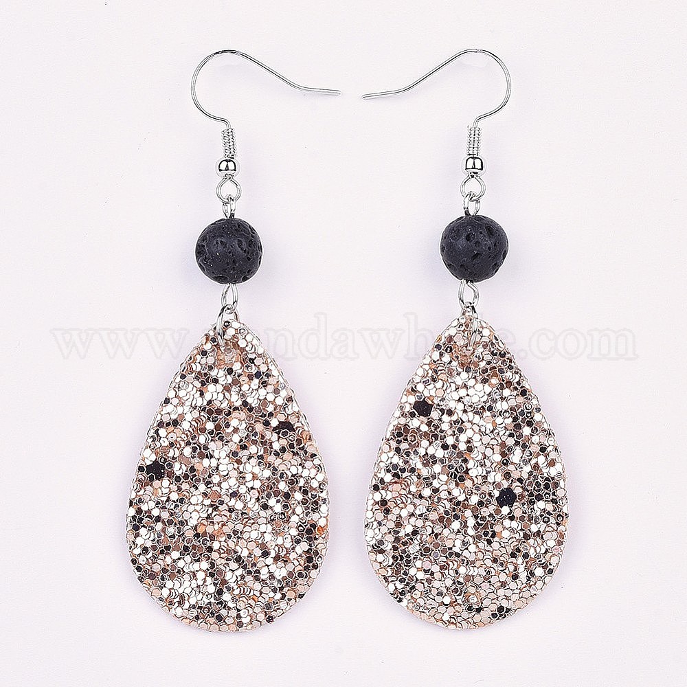 Серьги с блестками из искусственной кожи, с бусинами из натуральной лавы и латунными крючками для серег, платина