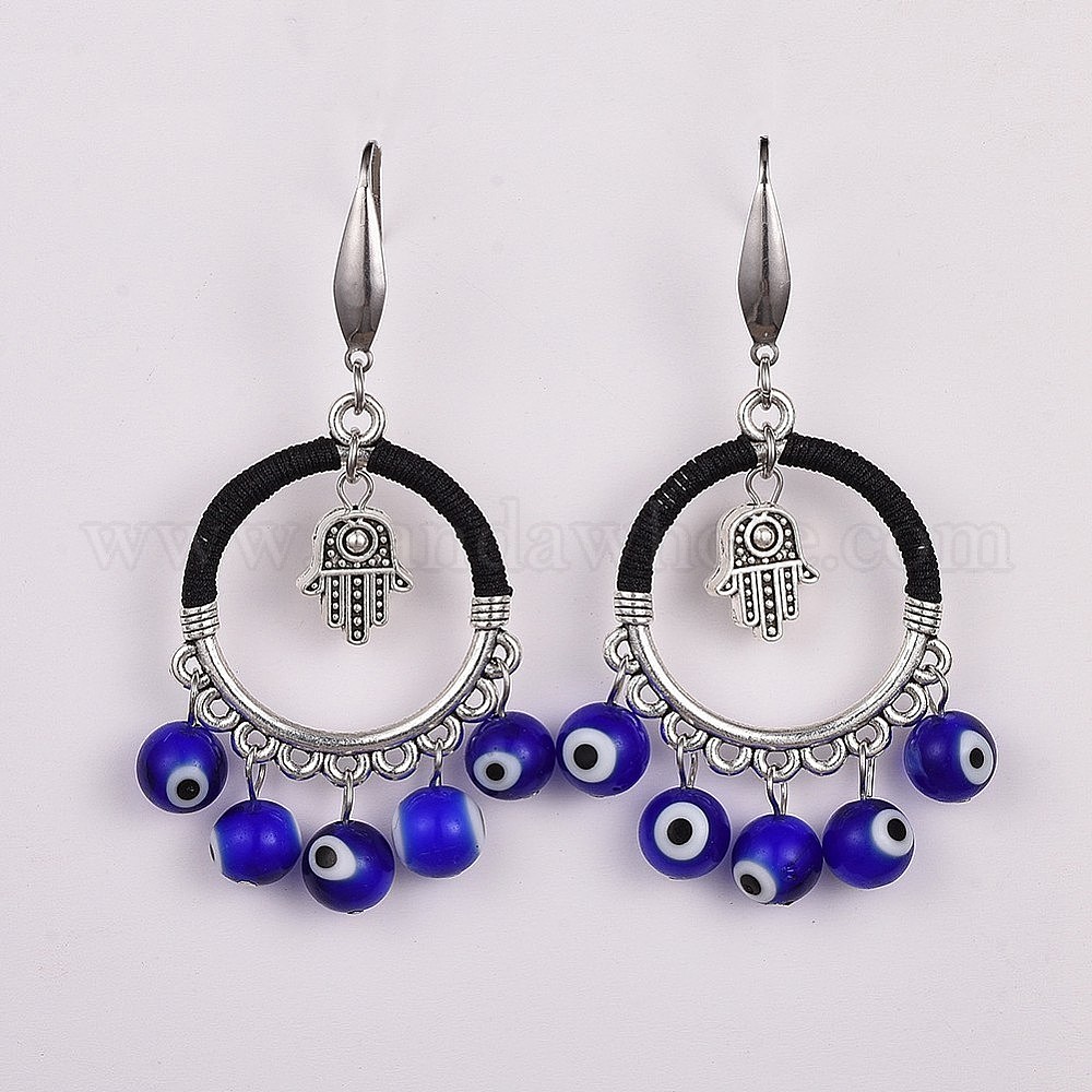 • Синий Бусины из лампочек мотаются серьгами, с бусинами сплава, 316 хирургические крючки для серег из нержавеющей стали и нейлоновая нить, хамса руки и сглаз, синие, 66 мм , штифт: 0.74 мм
