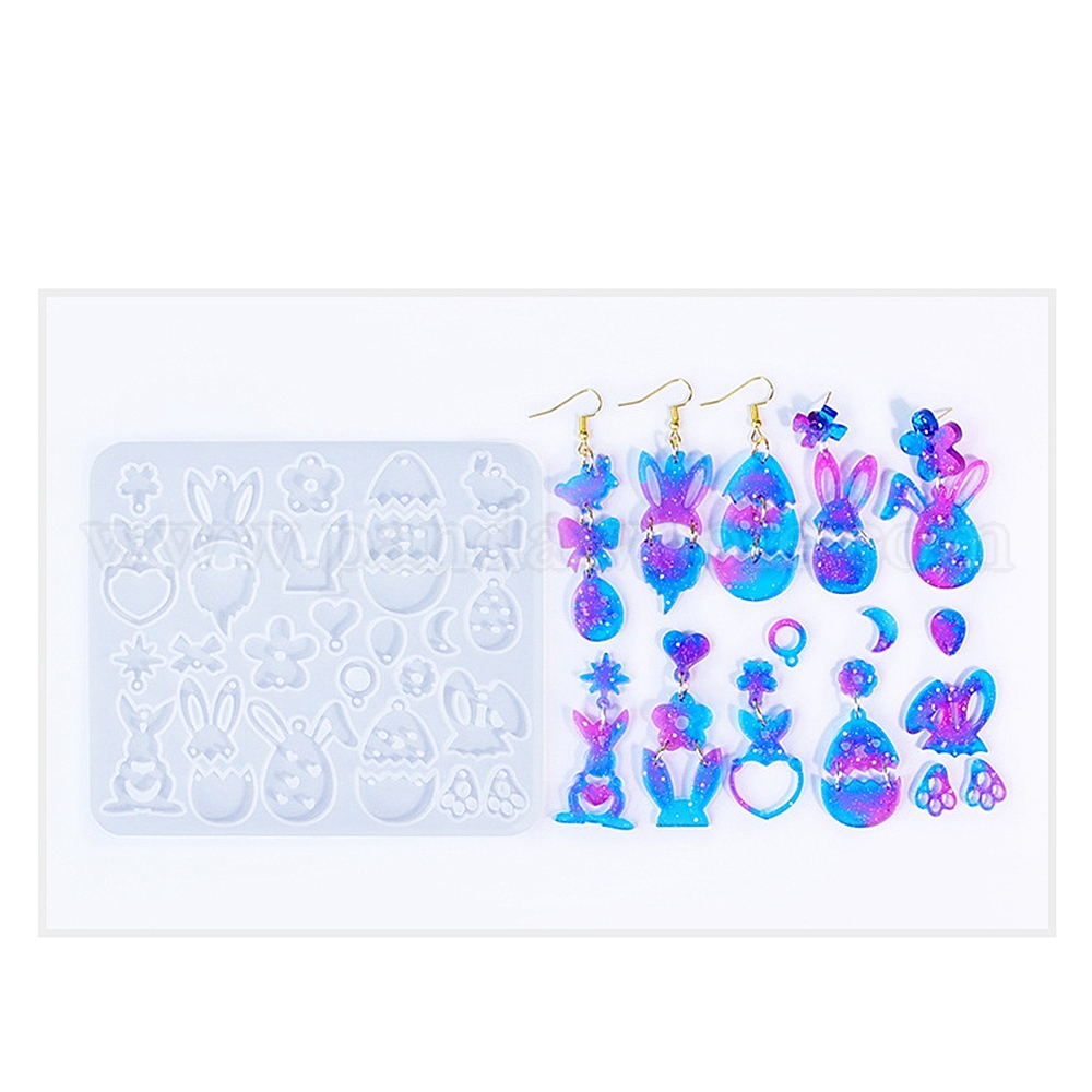 • Белый Пасхальные формы для подвесок своими руками, силиконовые формы для литья, для уф-смолы, изготовление изделий из эпоксидной смолы, кролик и яйцо, белые, 129x112x5 мм, отверстие : 1.5 мм