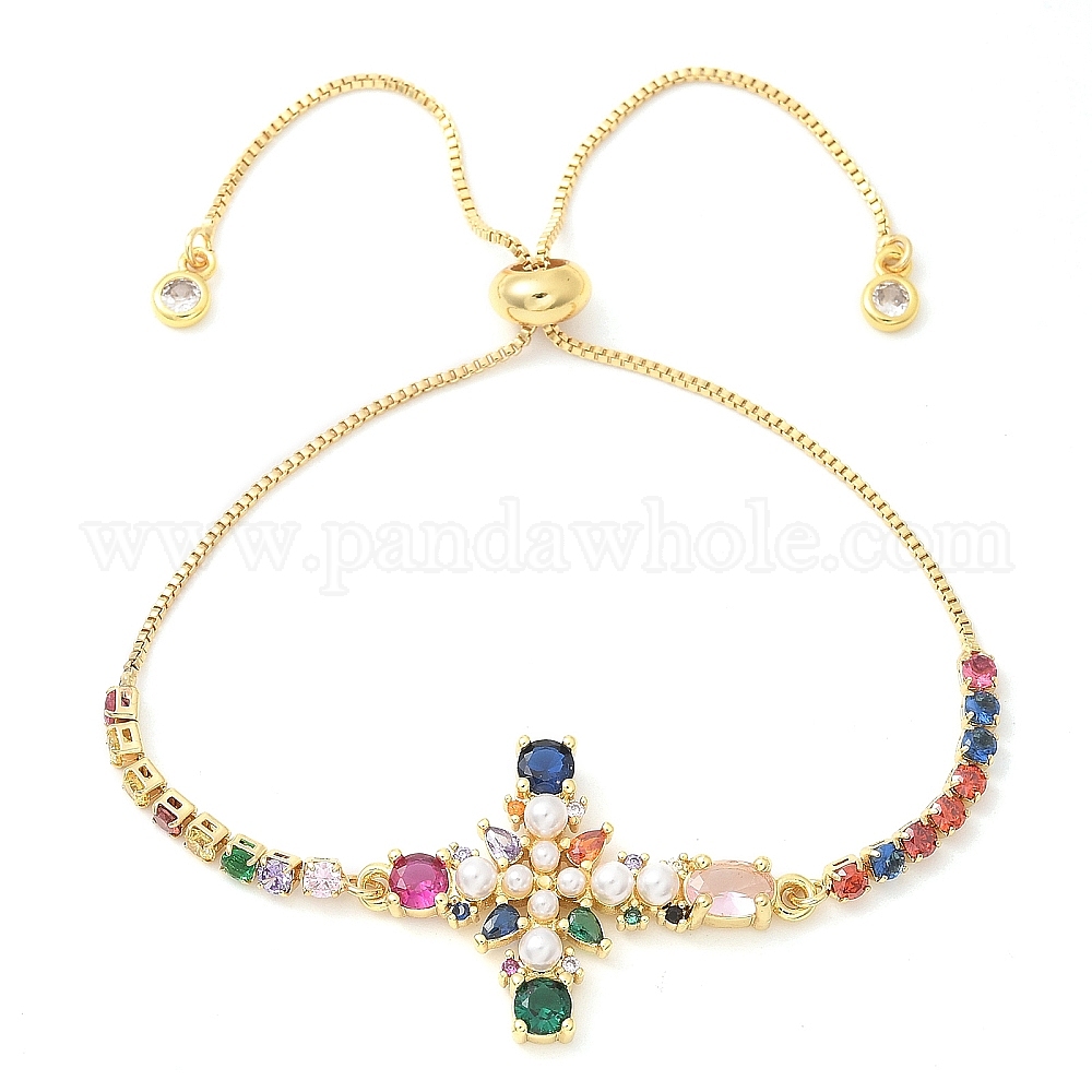 Латунь микро проложить кубический цирконий слайдер браслеты, браслеты с цепочками-кросс-коробками для женщин, с пластиковыми жемчугом