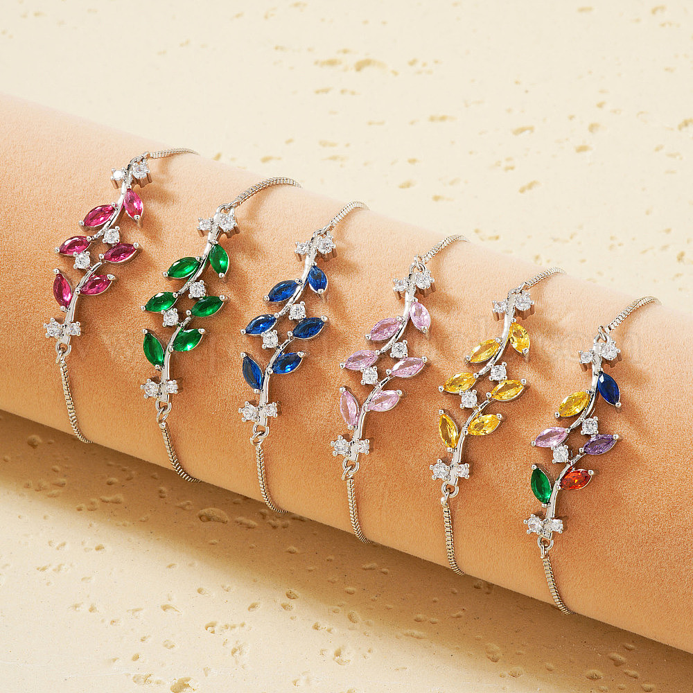 • Небесно-голубой Браслеты-слайдеры из латуни с микропаве и кубическим цирконием, браслеты с подвесками в виде листьев для женщин, платина, голубой, 9-1/4 дюйм (23.6 см)