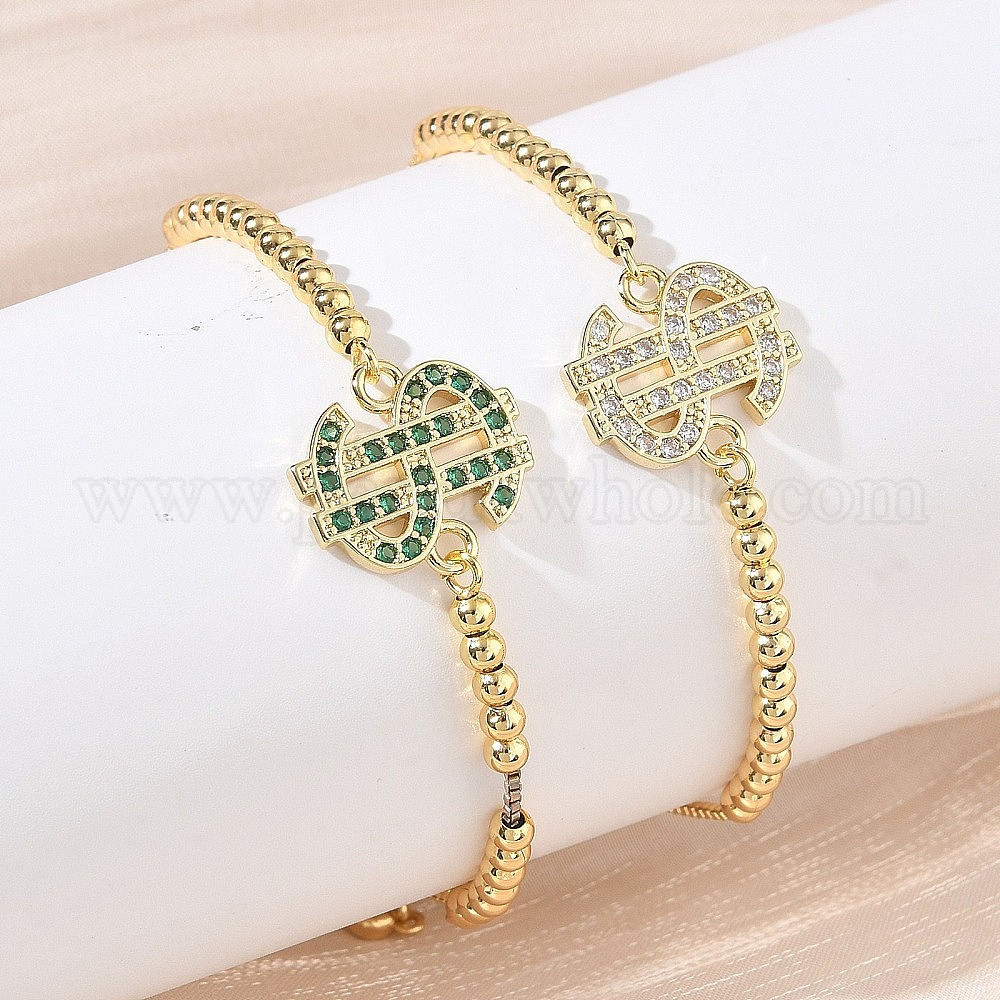 Регулируемые латунные браслеты-слайдеры с микропаве из кубического циркония и звеньями в виде знака доллара для женщин., реальный 18 k позолоченный (03BTND)
