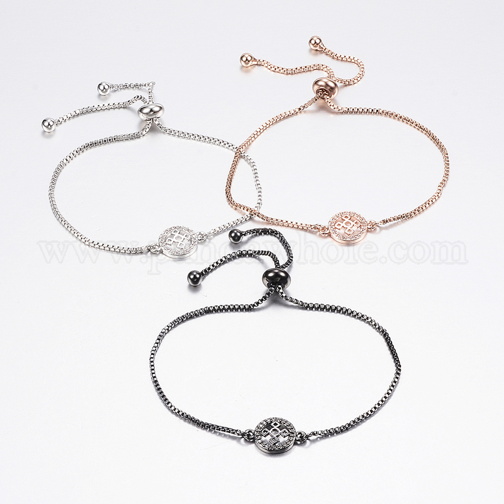Регулируемые латунные браслеты Боло, слайдерные браслеты, с фианитом и цепочками, плоско-круглые