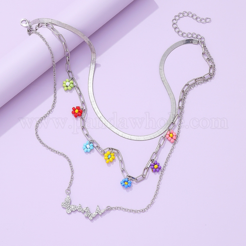 • Платина Сплав 3 ожерелья из слоев, стеклянные бусины разноцветные цветочные нагрудники ожерелья, платина, 15.75 дюйм (40 см)