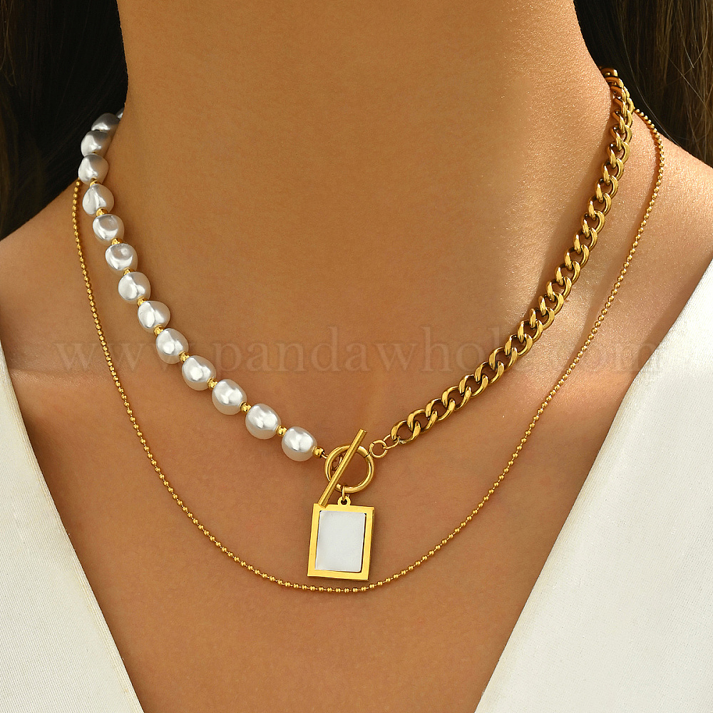 201 Асимметричные двухслойные ожерелья из нержавеющей стали и белого искусственного жемчуга, прямоугольные подвески для женских праздничных нарядов