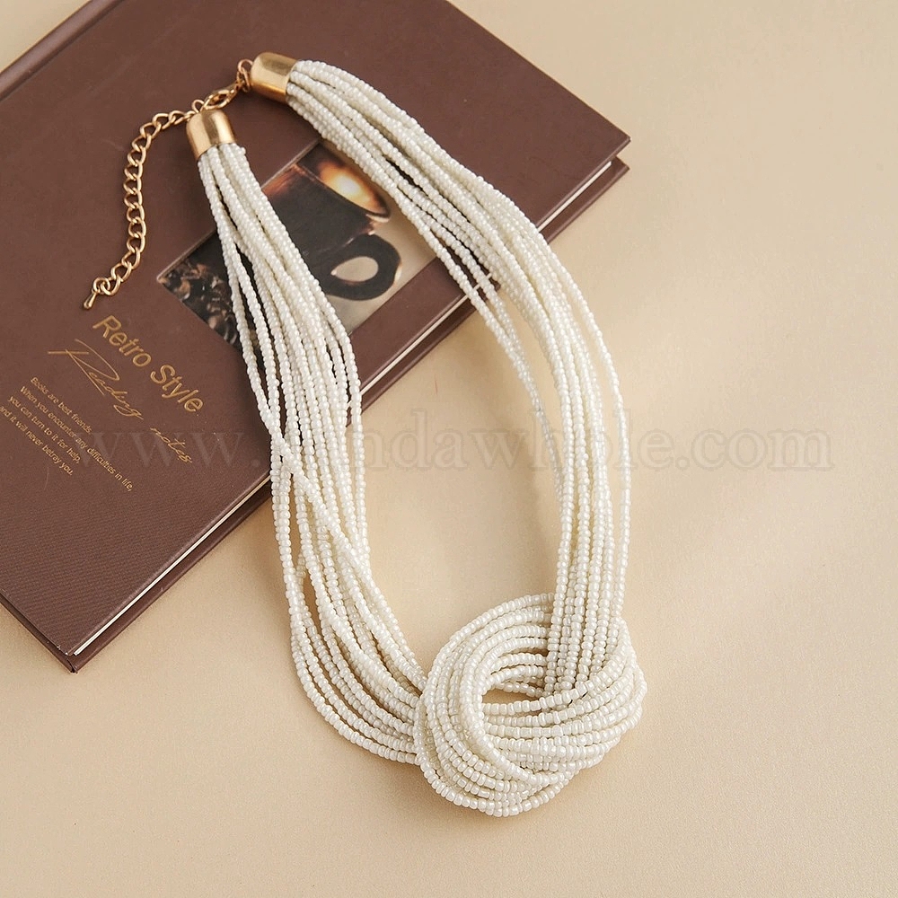 • Белый Многорядные ожерелья из стеклянных бусин в стиле бохо, узел, С золотыми результатами железа, белые, 24.57 дюйм (62.4 см)