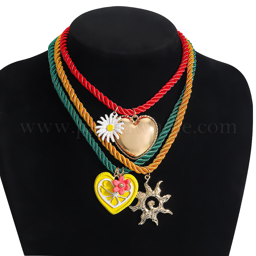 Подвеска в виде сердца и подсолнуха из сплава с эмалью, витой круглый хлопковый шнурок 3 многослойные ожерелья для женщин, золотые