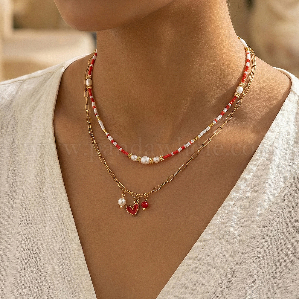 Подвеска в виде красного сердца из латуни с эмалью, двухслойное ожерелье., 304 Цепочка из нержавеющей стали в виде скрепки и ожерелье из жемчуга фук и стеклянных бусин
