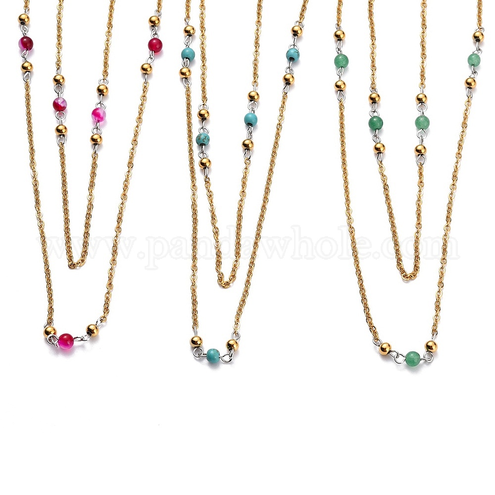 304 двухслойные колье из нержавеющей стали, с тросовыми цепями и круглыми бусинами из натуральных и синтетических драгоценных камней