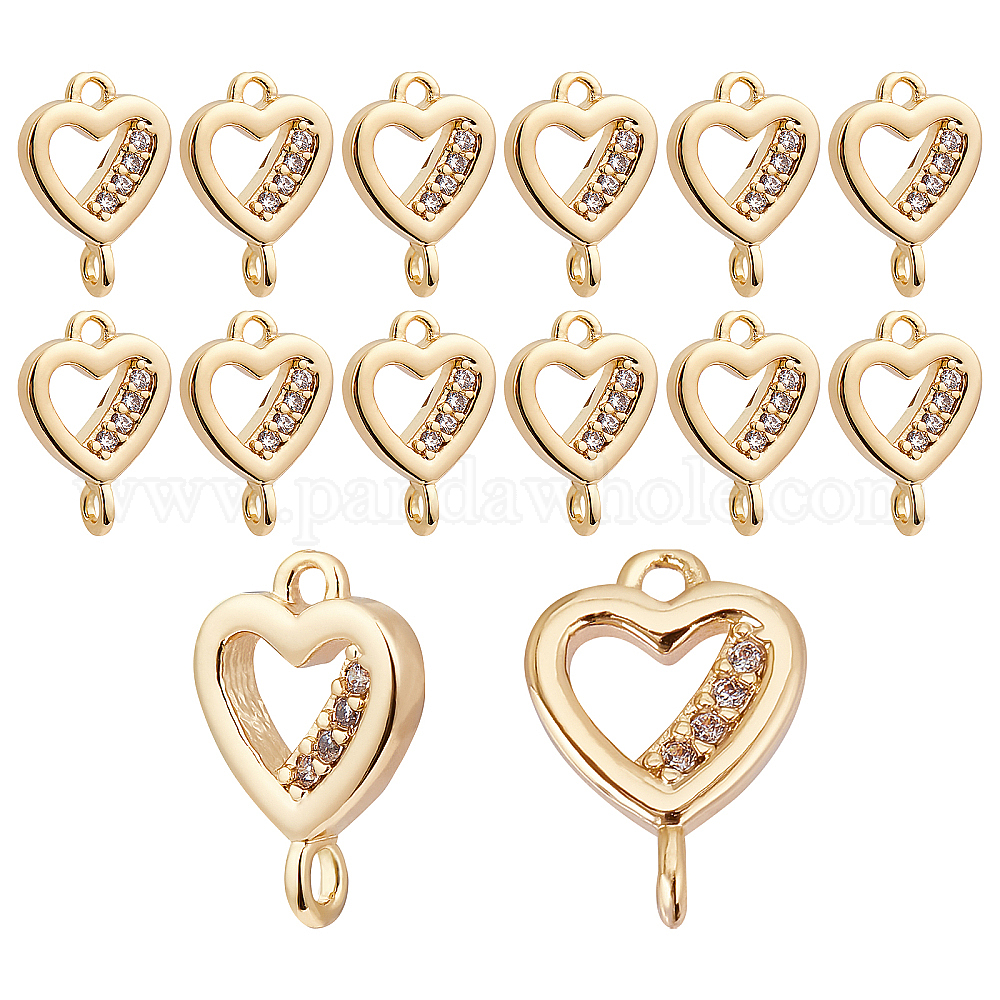 • Настоящее золото 14K 16соединители звеньев из латуни с микропаве из прозрачного кубического циркония, долговечный, сердце, реальный 14 k позолоченный, 11x7.8x2.5 мм, отверстие : 1 мм