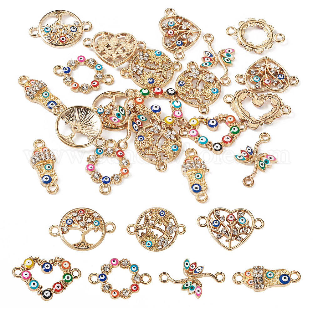28шт 7 стили сплав красочные эмалированные подвески разъема, ссылки сглаза, золотые, с кристально горный хрусталь, обувь и стрекоза и сердце и дерево, разнообразные