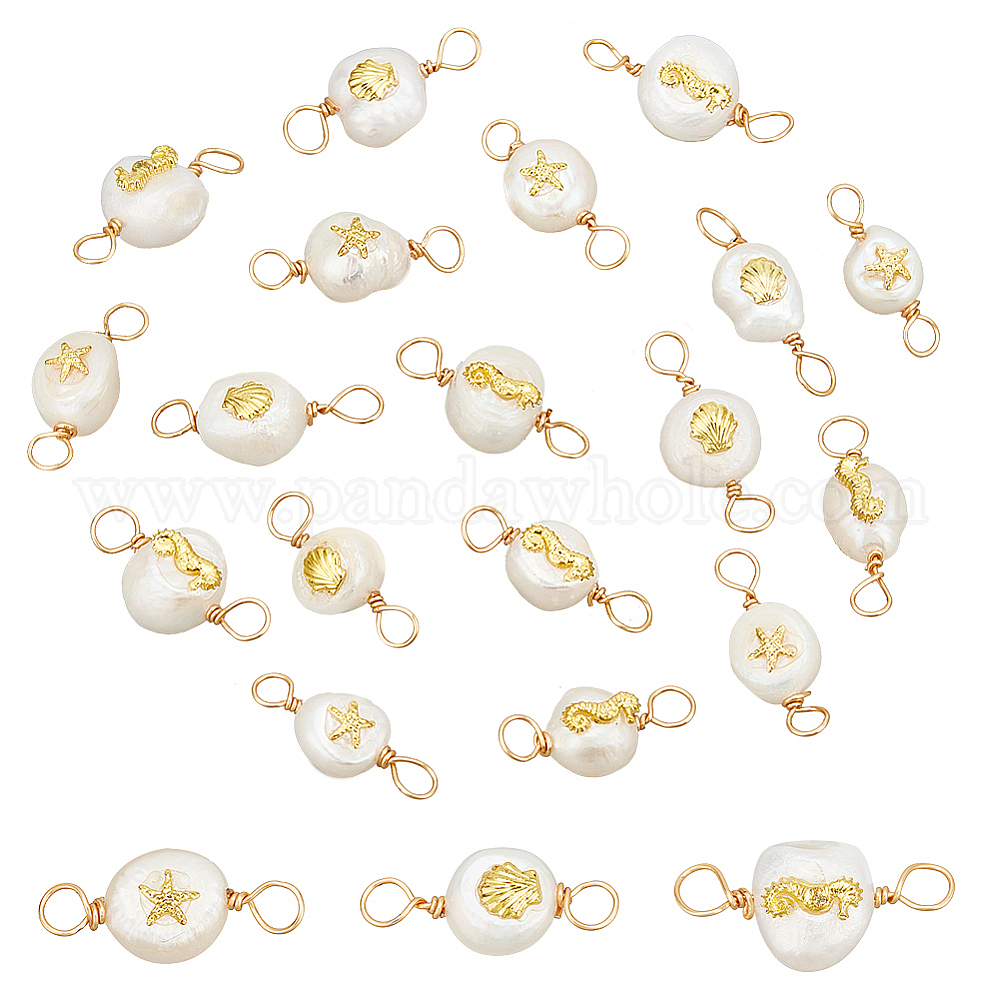 • Золотой 10 комплекты подвесок-коннекторов из натурального культивированного пресноводного жемчуга класса АА с пластинками из сплава, двух сторон полированной, с двойной петлей из медной проволоки, морской конек, раковина и морская звезда, золотые, 20~21x8~9x6~8 мм, отверстие : 2.5 мм, 3 шт / комплект