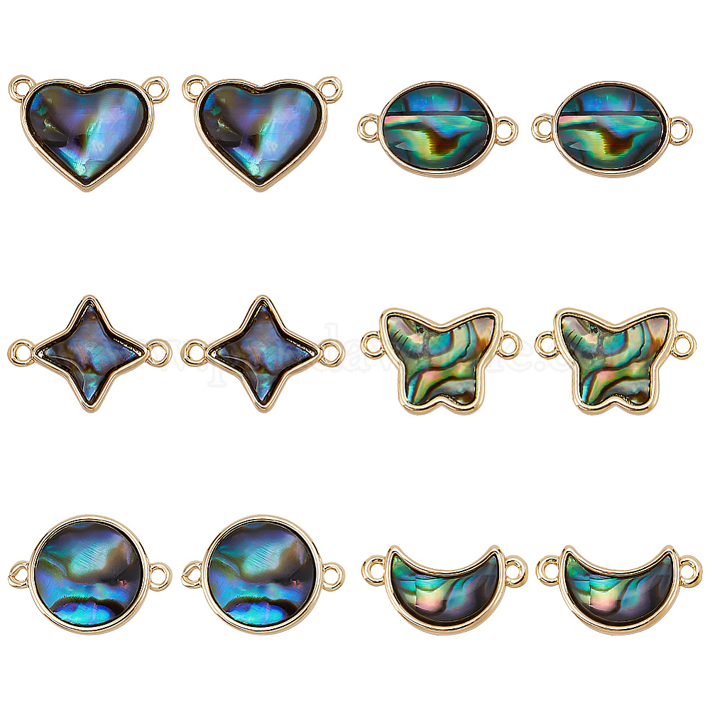 12 шт 6 стили paua shell соединительные подвески, с латунной фурнитурой , сердце и бабочка и плоский круглый, разнообразные