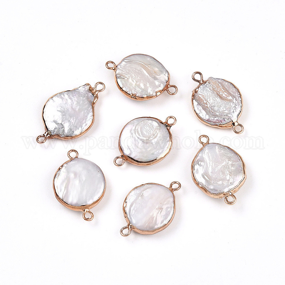• Морская Ракушка Гальванизированный натуральный жемчуг Кеши плоские круглые подвески-коннекторы, культивированный пресноводный жемчуг барочный жемчуг ссылки, золотые, цвет морской раковины, 23.5~28.5x15.5~17x4.5~8.5 мм, отверстие : 1.8 мм