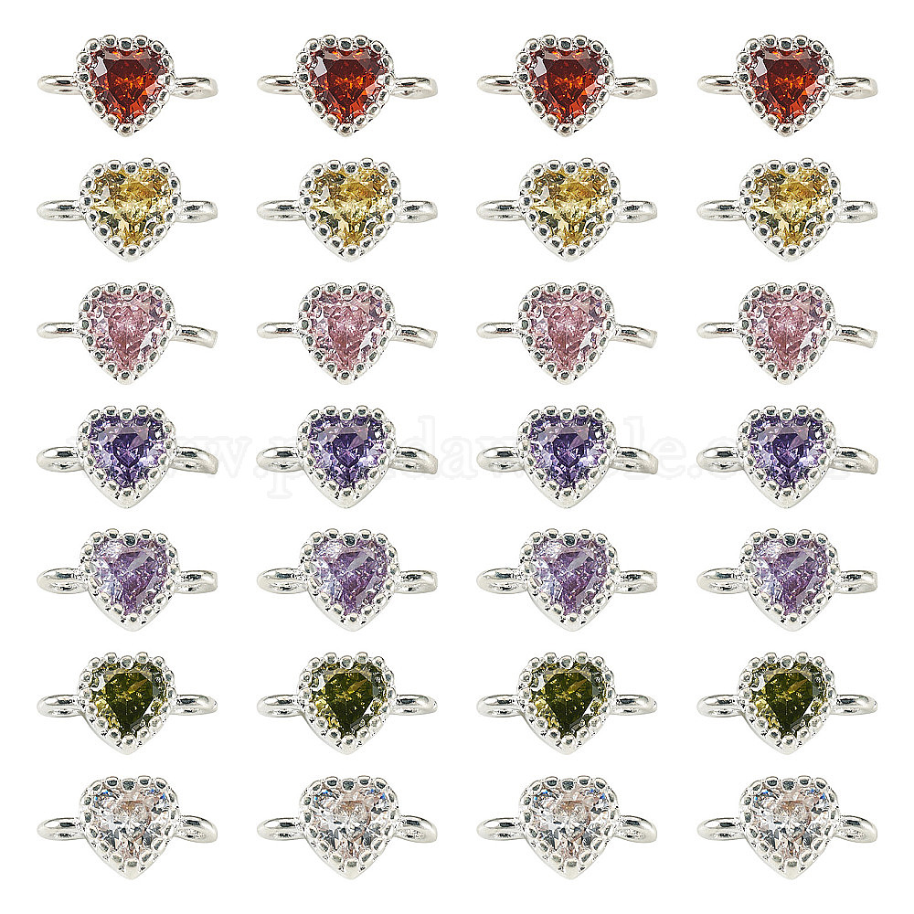 28шт. 7 цвета латунь паве кубический цирконий звенья сердце соединительные подвески, долговечный, стойки покрытие, серебряный цвет гальваническим, без кадмия, без никеля и без свинца