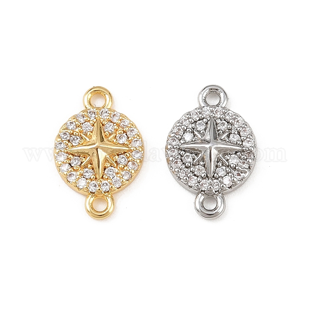 Шармы-соединители из латуни с микропаве из прозрачного кубического циркония, плоский круглый со звездочками