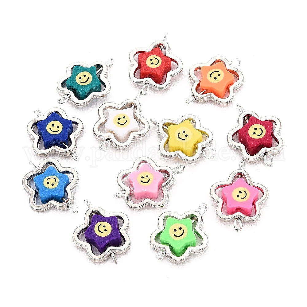 Бусины-звездочки из полимерной глины с улыбающимся лицом и пластиковой оправой CCB, подвески-подвески, с латунными двойными петлями, платина