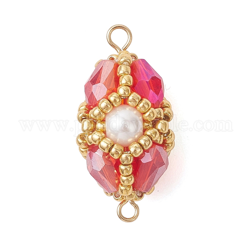 • Красный Овальные подвески-коннекторы из стеклянных бусин, со стеклянными бисеринами, золотые, красные, 29x13.5~14 мм, отверстие : 2.5 мм