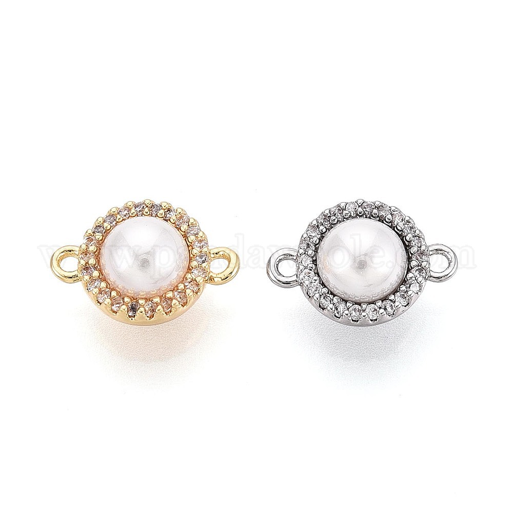 Соединительные подвески из латунных микропаве с прозрачными кубическими циркониями и бусинами из АБС-пластика, имитирующими жемчуг., плоские круглые ссылки, белые